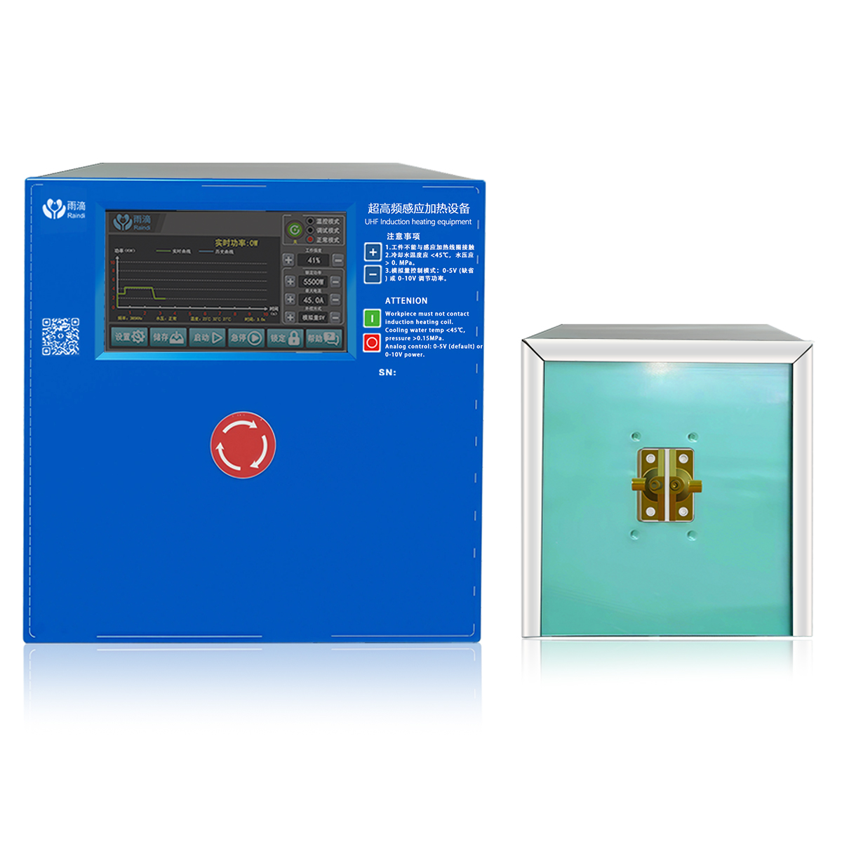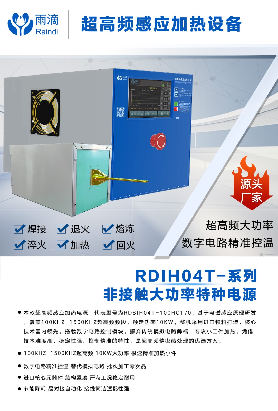 雨滴科技三相四代超高频感应加热设备,是专为工业制造场景打造的高性能水冷型感应加热电源装备。设备依托先进的电磁感应加热技术与数字控制方案,实现精准、高效、稳定的金属热加工,为各类精密工业生产提供可靠的加热解决方案。
